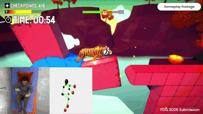 My Master’s thesis project introduces a novel human quadruped exergame where players control a virtual tiger through supine, bicycle-crunch-style movements tracked by a computer vision-based system. Designed for controller-free use in commercial activity parks, the system extends embodied interaction to non-human locomotion while effectively converging full-body exertion and gameplay immersion.