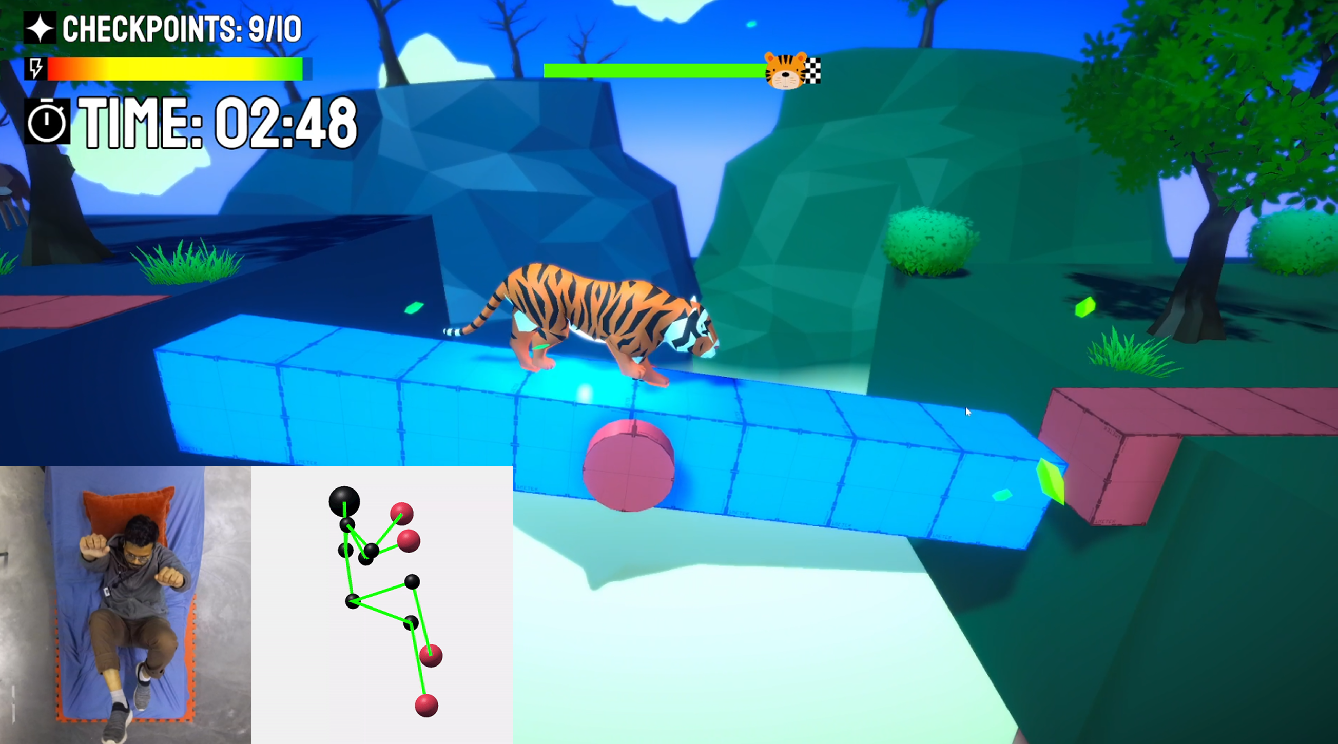 My Master’s thesis project introduces a novel human quadruped exergame where players control a virtual tiger through supine, bicycle-crunch-style movements tracked by a computer vision-based sensor. Designed for controller-free use in commercial activity parks, the system extends embodied interaction to non-human locomotion while effectively converging full-body exertion and gameplay immersion.